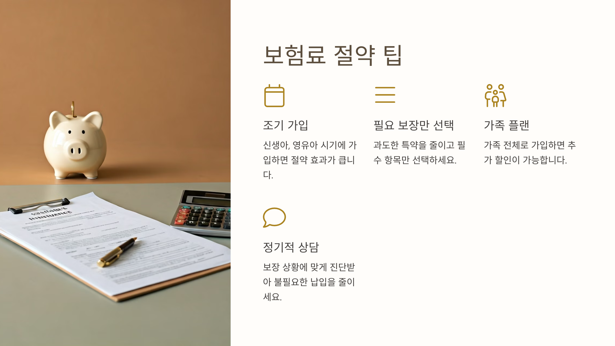 자녀 보험을 제대로 준비하려면 보장도 중요하지만, 보험료 관리도 정말 중요해요. 같은 보장을 받으면서도 보험료를 줄일 수 있는 방법들이 꽤 많답니다. 실질적으로 돈을 아끼면서도 아이의 건강을 든든히 지켜줄 수 있는 절약 전략들을 지금부터 알려줄게요.