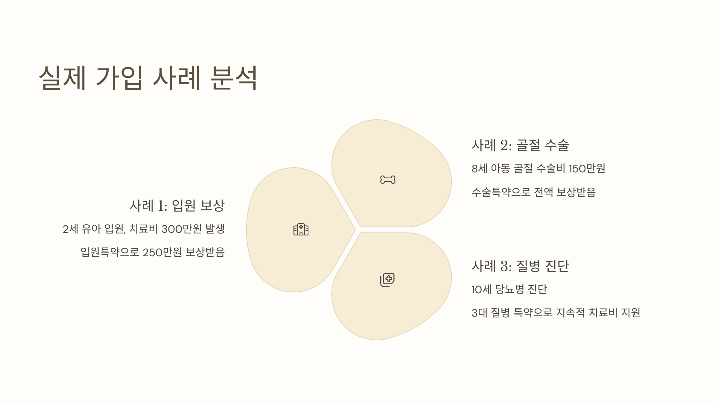 예를 들어 어떤 부모는 유치원에 다니는 동안 입원이 잦아 입원특약 위주로 보험을 설계했고, 어떤 부모는 가족력이 있어 암 관련 특약에 집중했어요. 이처럼 가정 상황에 따라 보험 설계는 완전히 달라질 수 있다는 점, 꼭 기억해 주세요!