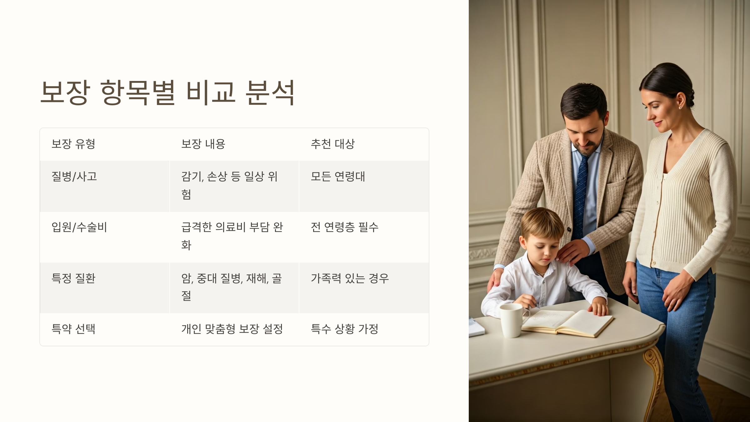 자녀 보험이라고 하면 대부분 질병, 사고 보장을 떠올리지만, 사실 교육자금 준비, 치아 치료 보장, 입원일당, 암 진단금 등 다양한 옵션이 있어요. 보장 범위와 보험료가 보험사마다 천차만별이기 때문에, 꼼꼼한 비교가 필수랍니다.