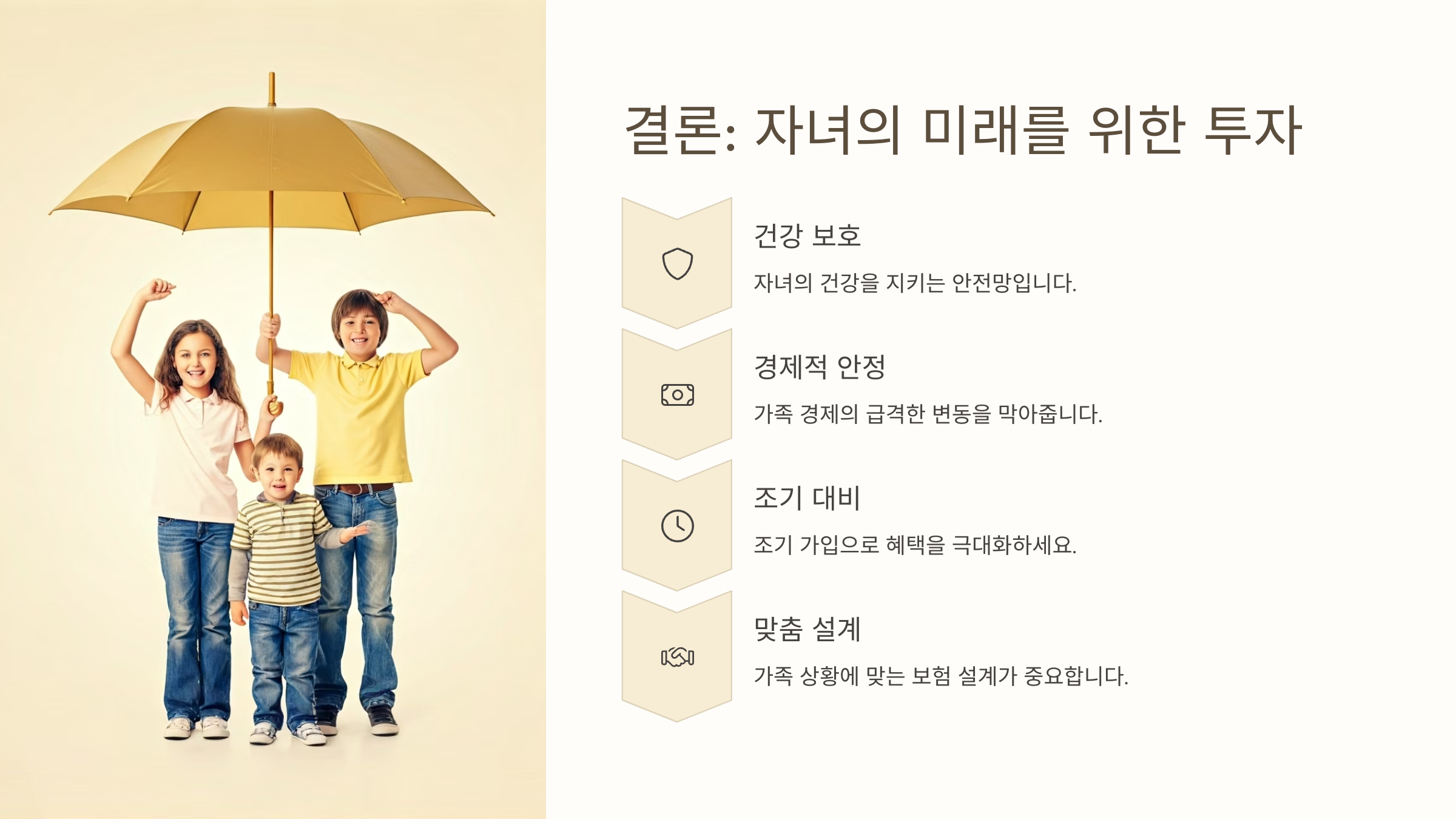 특히 한국에서는 국가 건강보험이 있긴 하지만 실손의료보험으로도 커버가 안 되는 고액 치료 항목들이 많아요. 이런 부분을 대비하려면 자녀 보험은 반드시 필요하다고 할 수 있어요. 자녀가 어릴 때일수록 보험료가 저렴하고, 건강 상태도 좋아 인수 거절될 가능성도 적답니다.