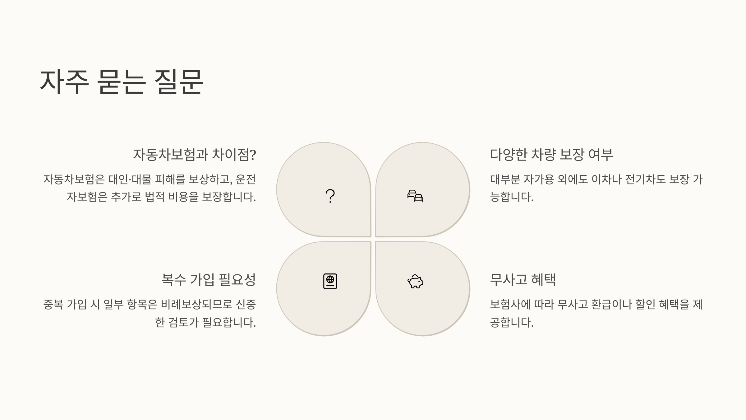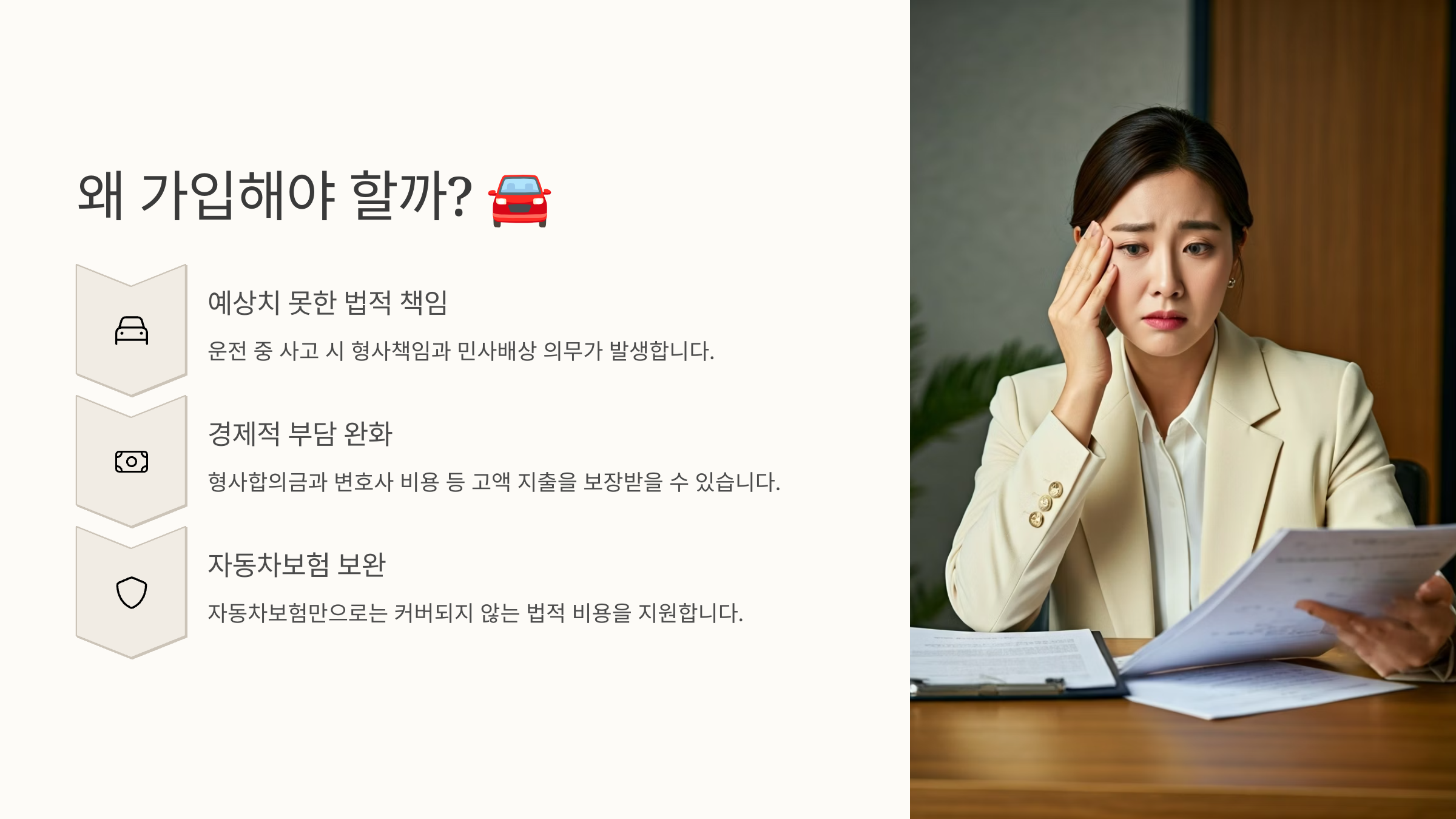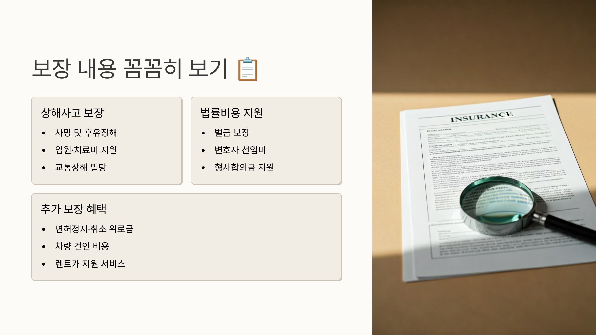 또 하나 중요한 점은 자동차 보험에서는 운전자의 법적 방어 비용이 포함되지 않는다는 거예요. 피해자 중심으로 구성돼 있기 때문에, 운전자 본인의 법적 책임을 보장받기 위해서는 별도 보험이 필수예요.