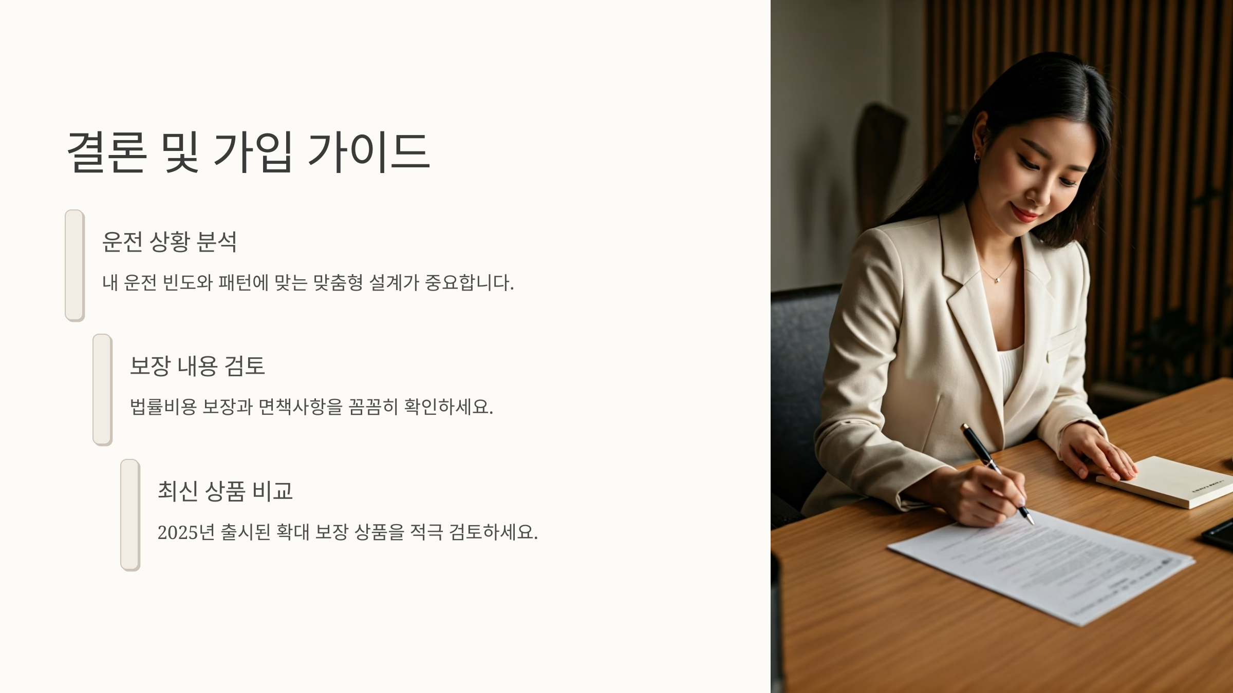 첫 번째는 '나에게 필요한 보장이 무엇인가'를 스스로 파악하는 거예요. 운전을 자주 하지 않는 사람이라면 최소 보장 중심의 실속형 상품이 좋고, 직업상 운전이 많다면 최대한 광범위한 보장을 선택하는 게 좋아요.