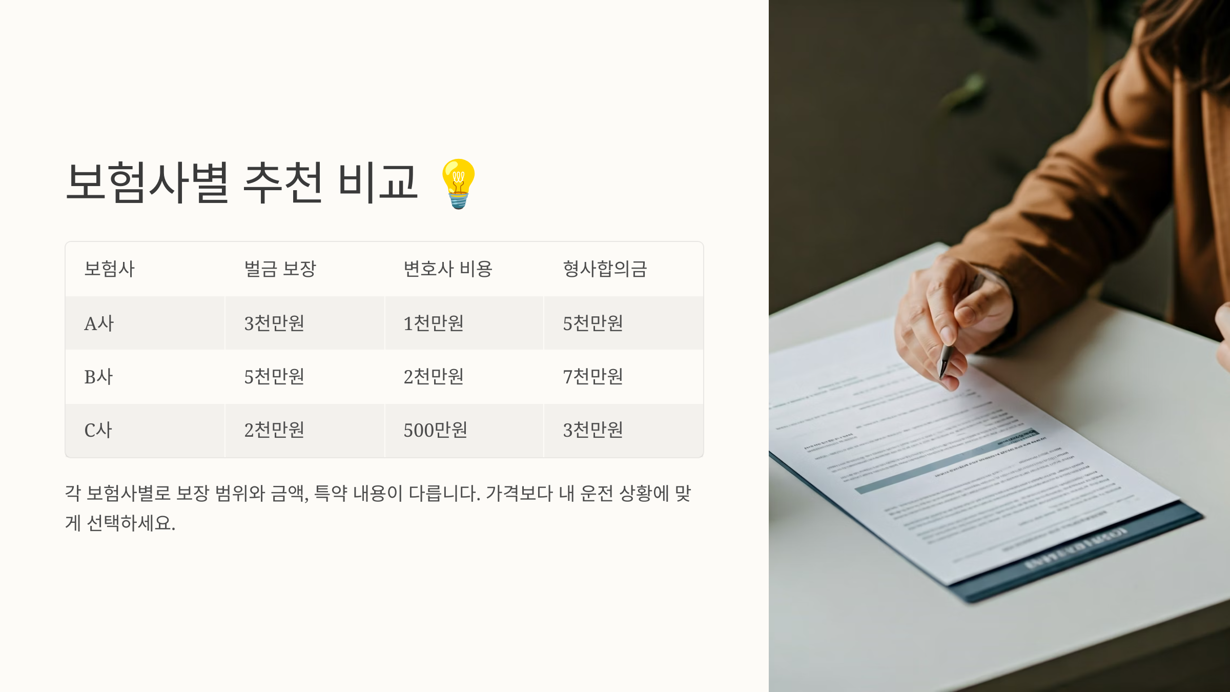 게다가 보험사마다 변호사 선임비를 최대 500만 원까지, 형사합의금은 3천만 원 이상 보장해 주는 상품도 있어요. 실제 사건 사례를 보면, 이런 보장이 없었다면 경제적 파탄에 이를 수도 있었던 분들이 많답니다.